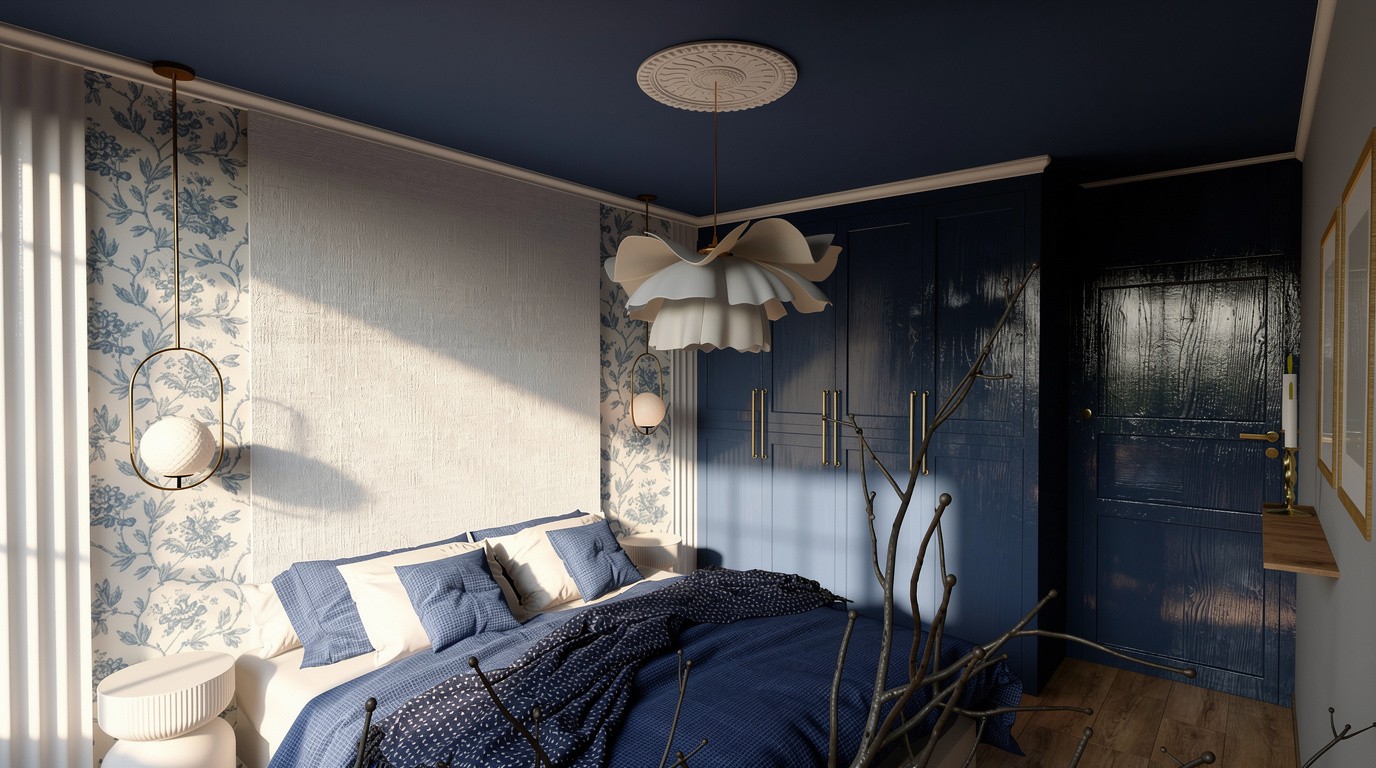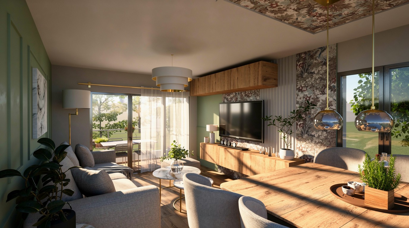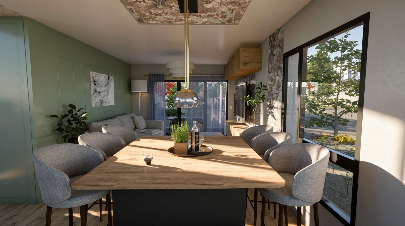 Dans la pièce de vie, le vert olive se marie avec une tapisserie graphique et à des touches dorées, tandis que le bois et le mobilier apportent chaleur et confort. La chambre propose un univers complètement différent : un bleu roi profond, des moulures délicates, un papier peint toile de Jouy et des lignes très contemporaines créer un équilibre entre tradition et modernité.