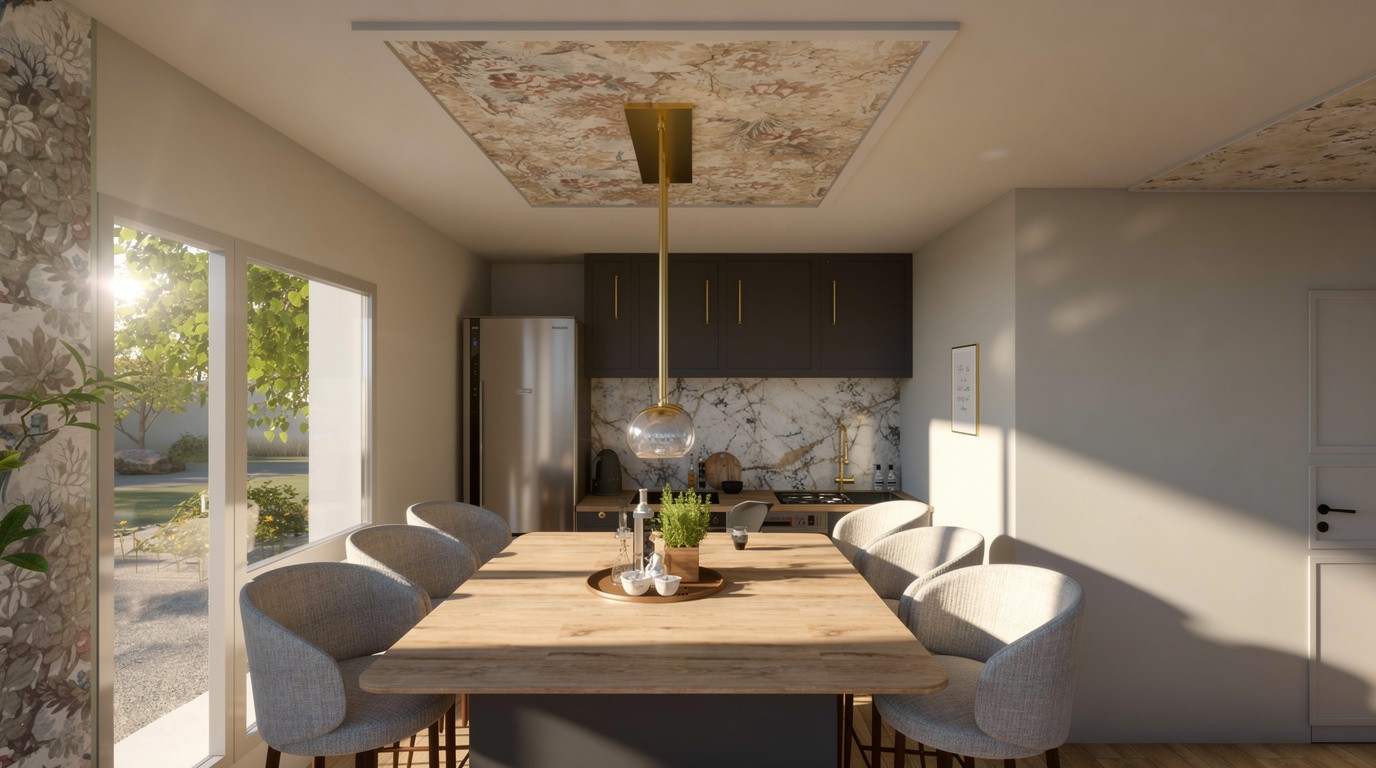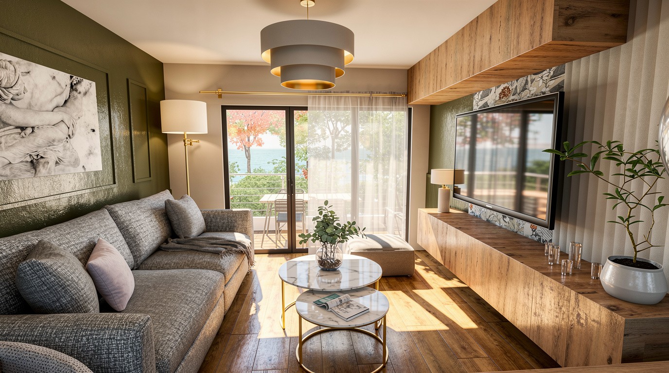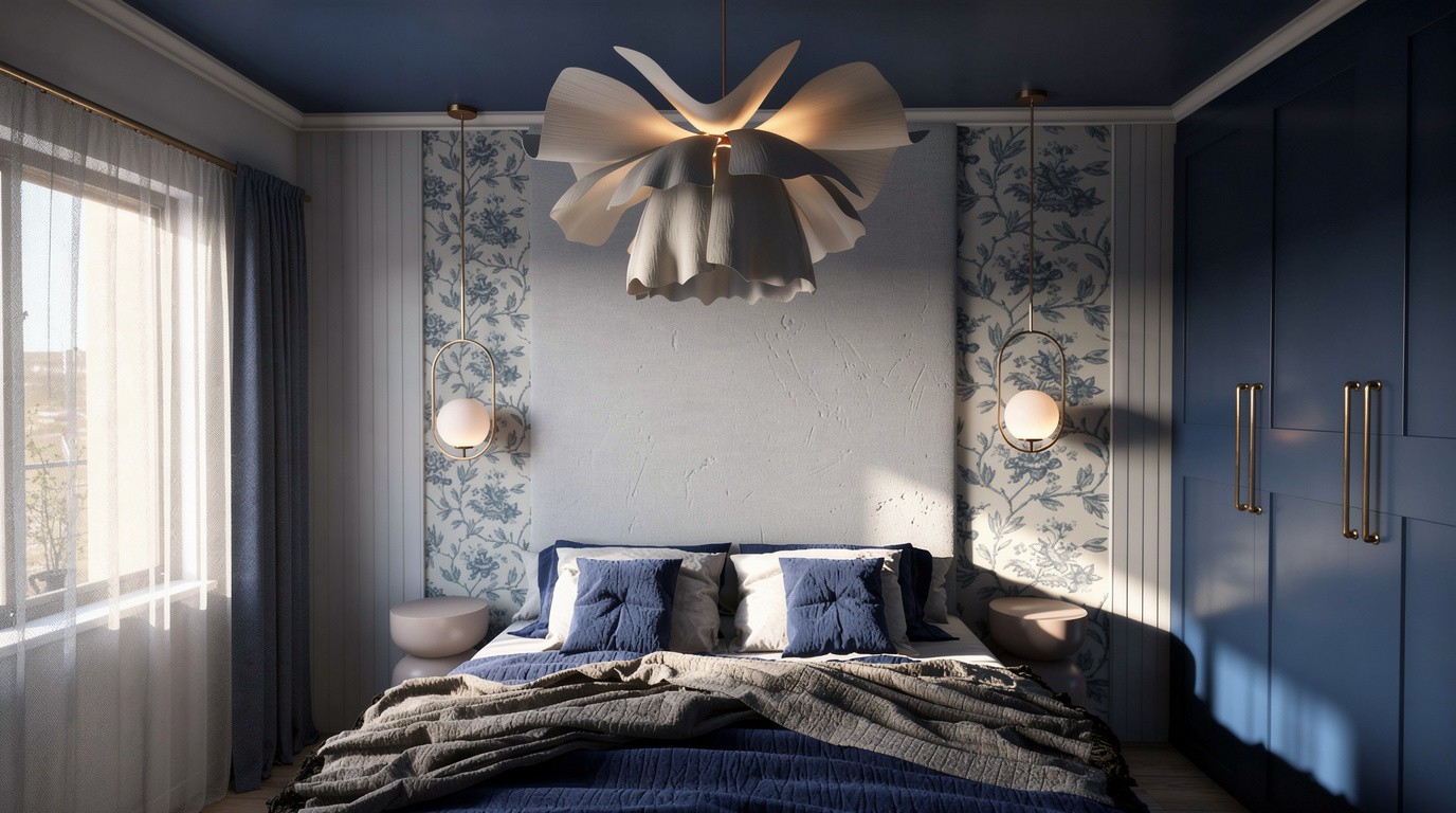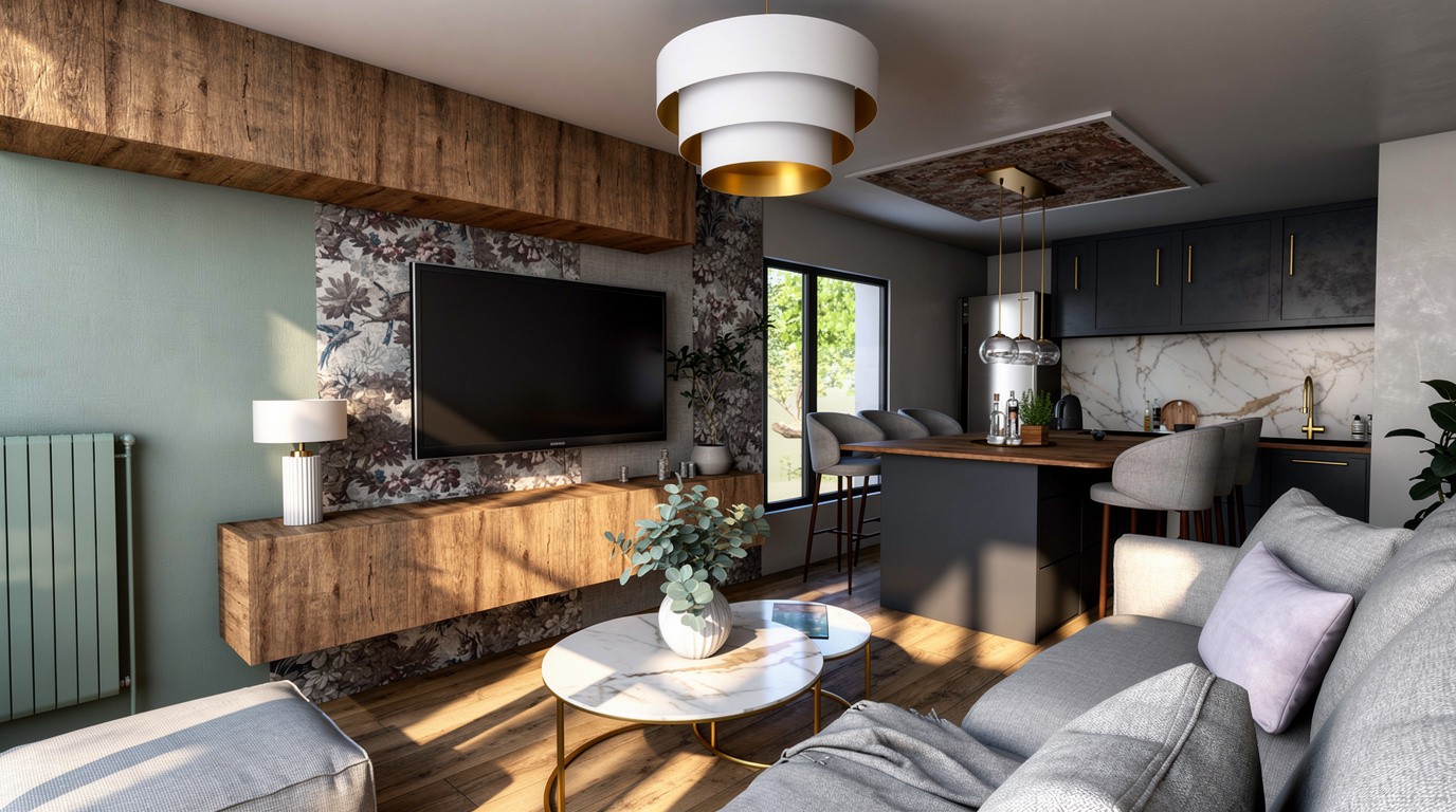 Dans la pièce de vie, le vert olive se marie avec une tapisserie graphique et à des touches dorées, tandis que le bois et le mobilier apportent chaleur et confort. La chambre propose un univers complètement différent : un bleu roi profond, des moulures délicates, un papier peint toile de Jouy et des lignes très contemporaines créer un équilibre entre tradition et modernité.