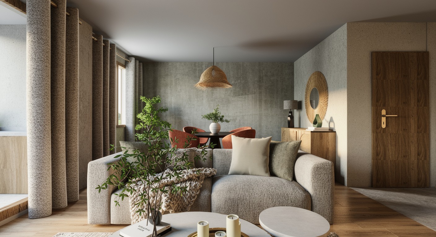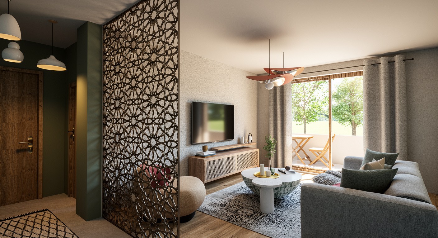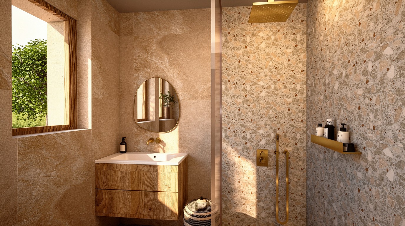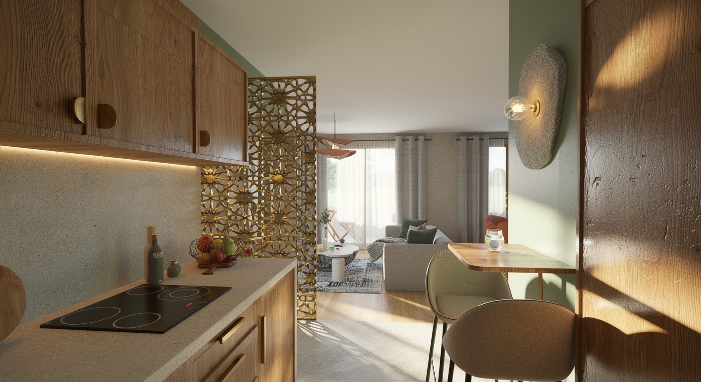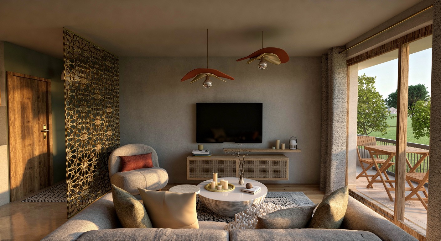 Des touches de doré viennent rythmer l'ensemble avec élégance, apportant des détails subtiles et raffinés. Les couleurs se déclinent autour du vert sauge et du terracotta, pensés pour s'intégrer naturellement à ce dialogue entre minéralité et chaleur.