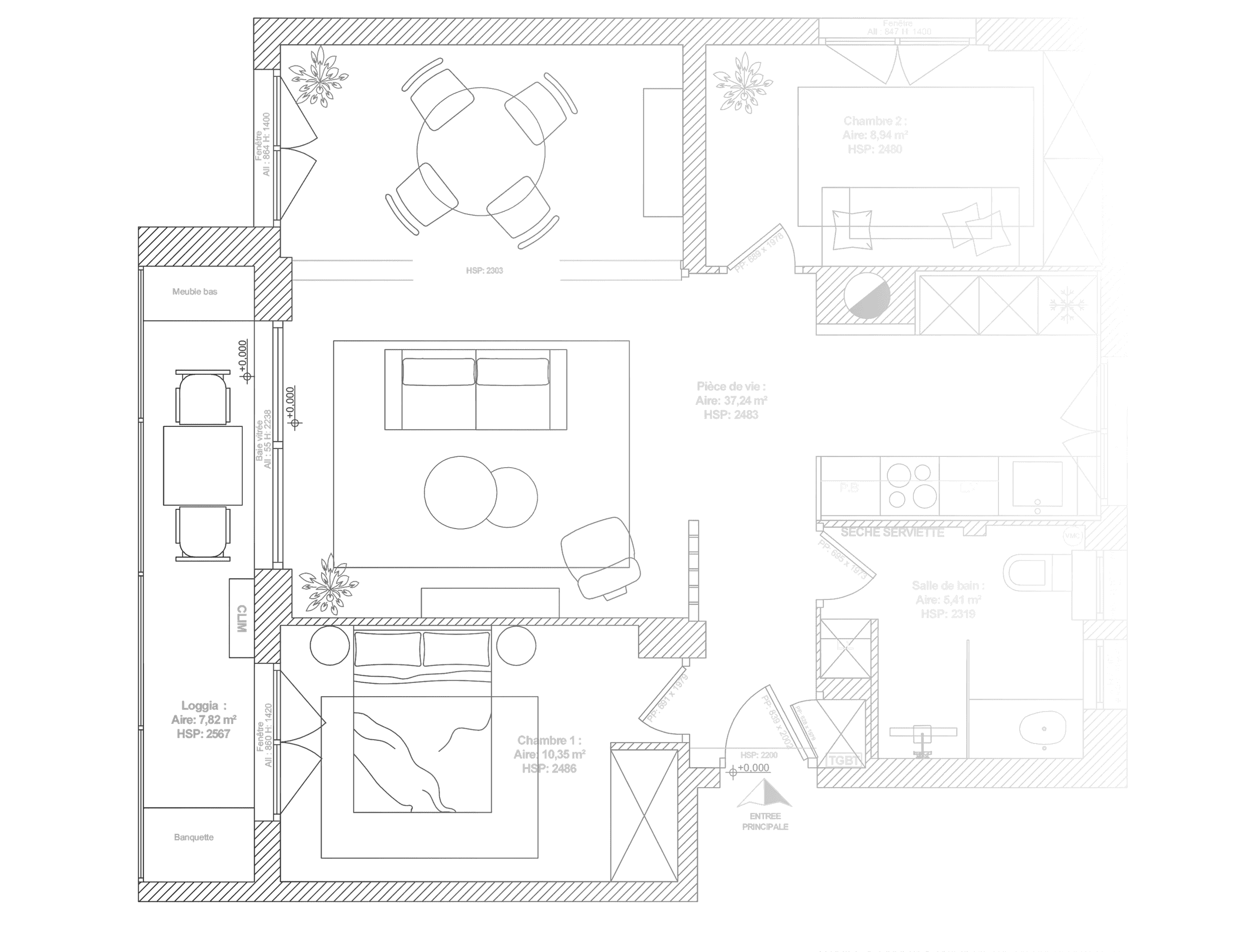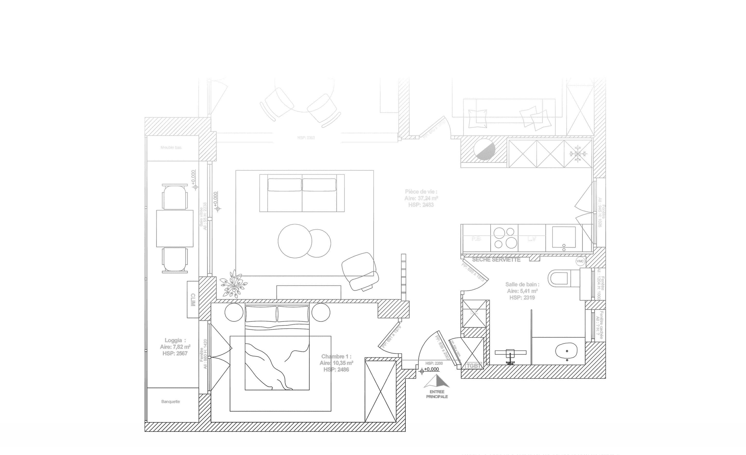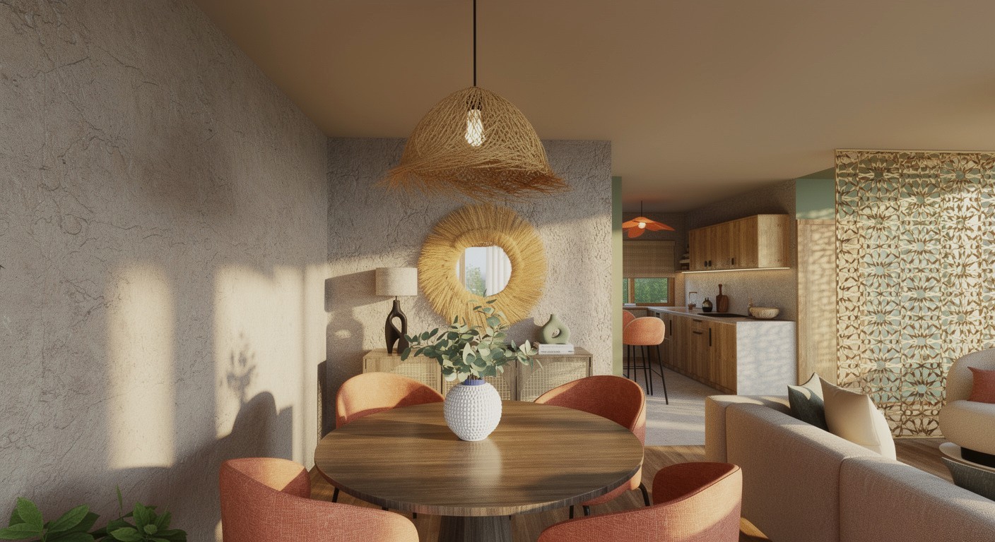 L'agencement optimise les circulations et offre une fluidité entre les différents espaces de vie. Le cœur du projet s'articule autour de la minéralité : des matériaux bruts et authentiques tels que le bois, le jonc et le raphia se mêlent à des finitions à la chaux et des surfaces minérales.