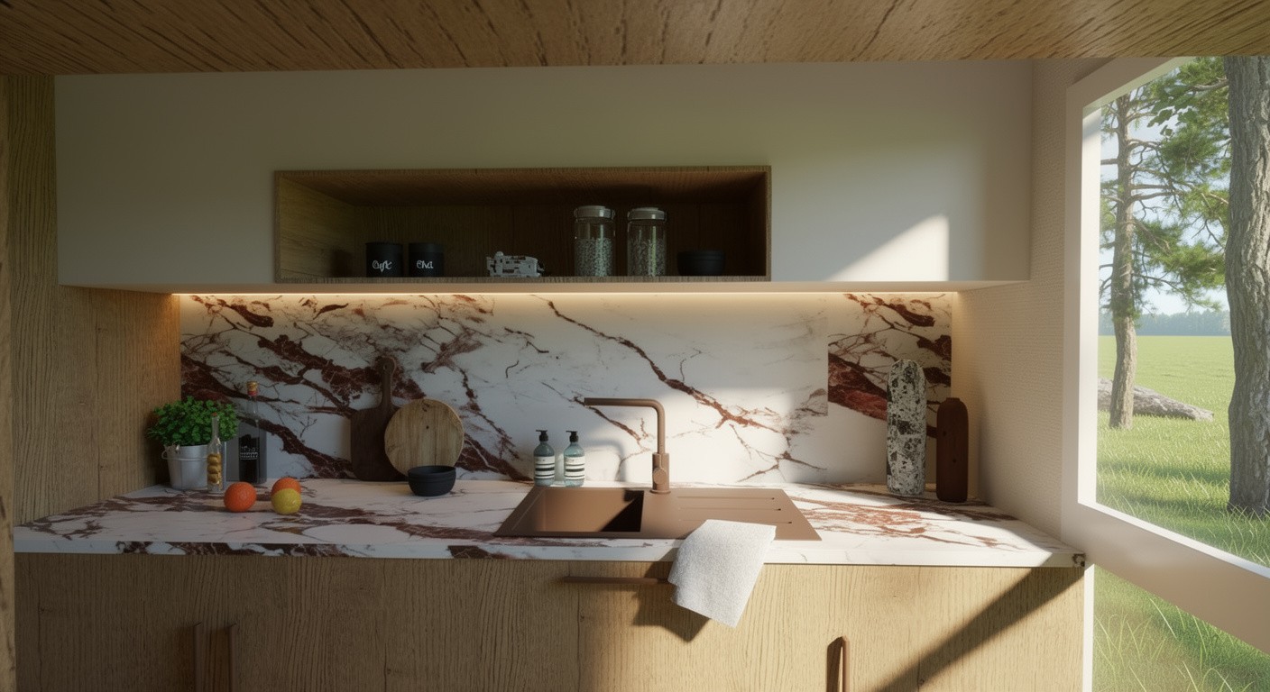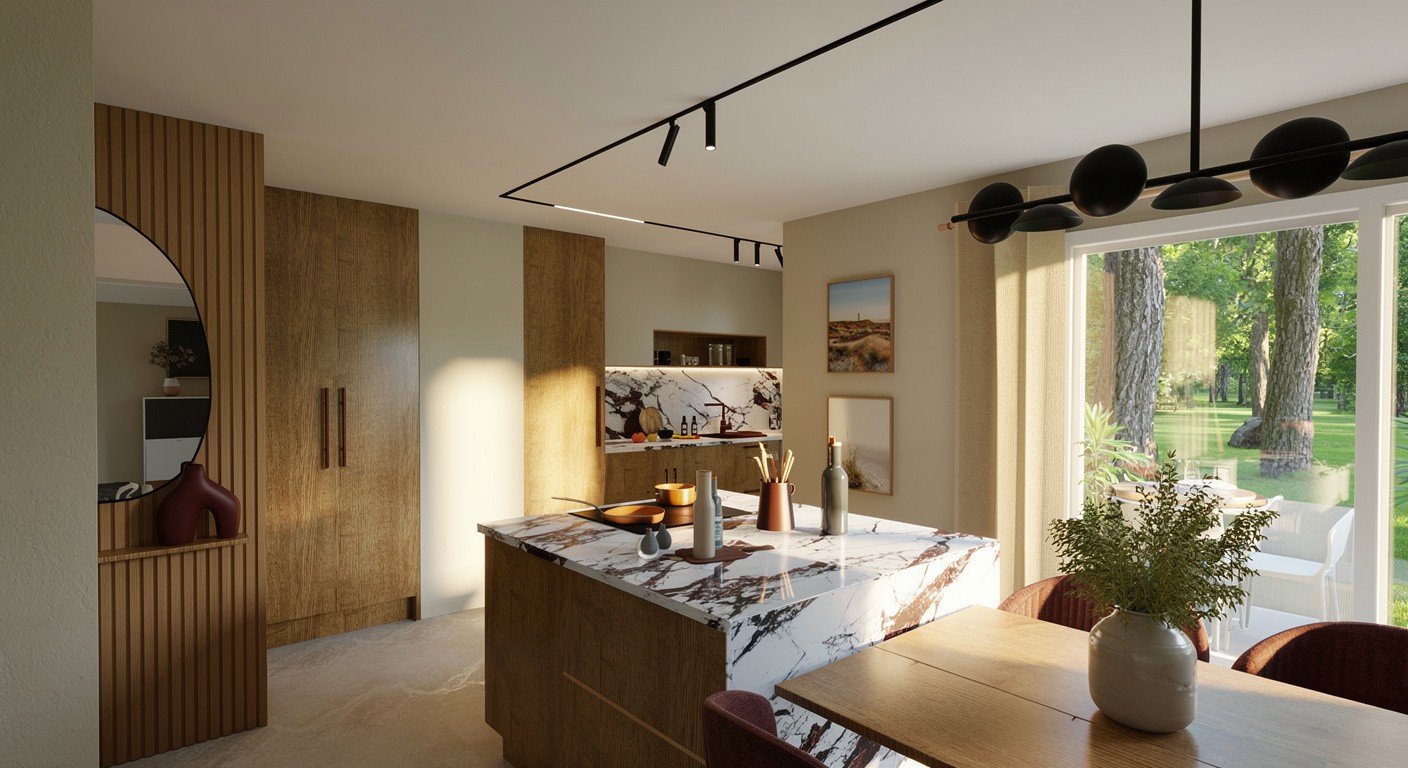 L'intention était d'ouvrir les volumes afin d'améliorer la circulation tout en valorisant la lumière naturelle. Les tonalités sont ici inspirées par la nature qui l'entoure : des tons beiges évoquent le sable des dunes proches, associées à la chaleur du bois apporte confort et douceur. Pour dynamiser l'espace et lui donner du caractère, des touches de bordeaux et un marbre veiné viennent souligner l'intérieur, créant un contraste élégant avec une palette naturelle.